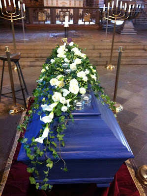 Två dagar i rad förra veckan hade vi kistdekorationer som vi behövdes byggas på plats på kistlocket. Här är den ena av dem. Den innehåller murgröna, callor, ranunkler, rosor, tulpaner och hypericum. Väldigt vackert när hela dekorationen sveper in kistan. Vi har fått mycket beröm för dekorationen och flera blomsteraffärer fotade den och undrade vem som hade varit så duktiga. Det värmer om hjärtat.