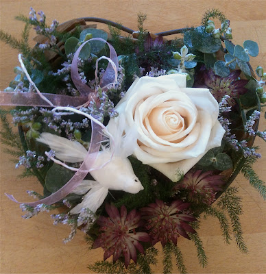 Ett litet arrangemang i en plåtkorg. Har klätt insidan med vaxat papper och innanför det vaxade pappret har jag preparerat med cellofan för säkerhets skull. Sen i med blötlagd oasis och sen har jag dekorerat hjärtat med en fin ros, lite stjärnflocka, eucalyptus, limonium, plumosus, en liten duva och till slut lite band.